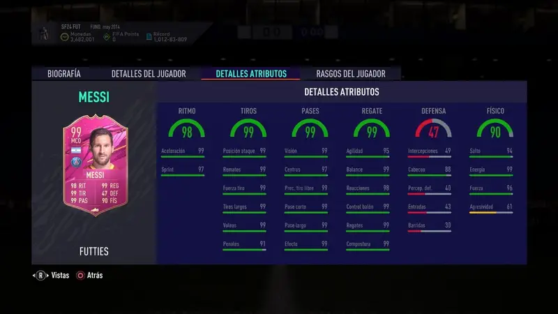 Con un 99 en general para su versión MCO sobre los 100 posibles, "La Pulga" acumula también 99 para los regates, los tiros al arco y los pases, mientras que suma 98 para el ritmo de juego, 90 para el físico y apenas 47 para la defensa.