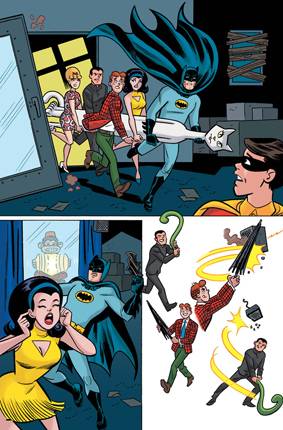 El primer capítulo es raro, porque es parte historia de Batman y parte historia de Archie, con un ligero giro al final que vincula a las dos. Pero más allá de eso, para el fan de Adam West es una fiesta. Todo empieza con un ataque de Poison Ivy a una feria, pero que en realidad es parte de un plan de Bookworm para robarse un libro digital. Por su parte se vuelve a juntar el “United Underworld”, la asociación ilícita formada por el Pingüino, el Acertijo, Gatúbela y el Guasón (perdón, pero en este caso para mi los nombres de los villanos son estos) que vimos en la película de este Batman que -cansados de ver sus planes fracasar- deciden mudar sus actividades delictivas a un lugar donde Batman no los joda y sea mas fácil de controlar. Obviamente el lugar elegido es Riverdale. Y para poder concretar su plan, llevan a Sirena que con su canto controla a los adultos, para ayudarles a tomar el control de la ciudad. A raíz de esto, Dick Grayson y Barbara Gordon viajan a la ciudad de Archie y se anotan en la secundaria para tratar de descubrir lo que sucede y de ahí en adelante la historia seguirá su curso con algunos altibajos.