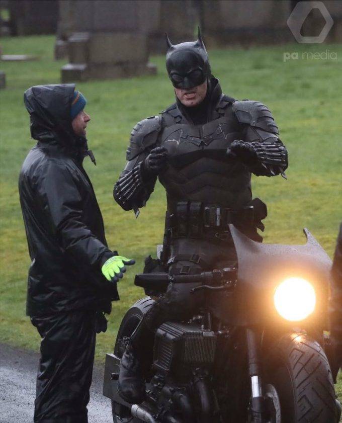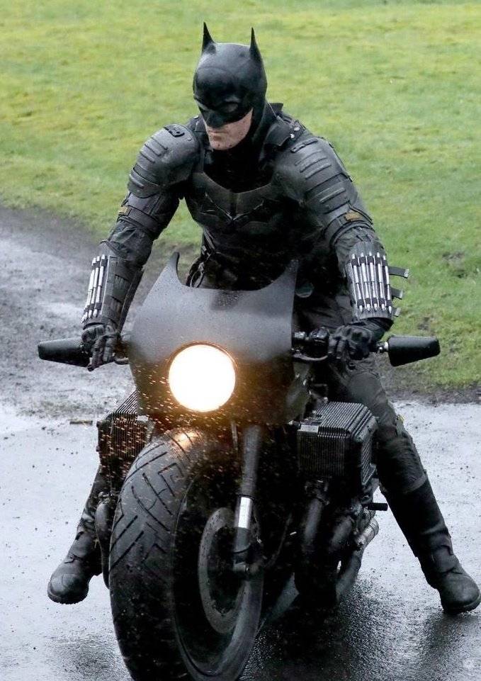 Asimismo, el personaje no tiene su característica capa, lo que hace suponer que la misma estará generada por computadora, al menos en la escena que estaban filmando en Escocia, en la cual Bats monta la Batcicle y se cae de la misma.