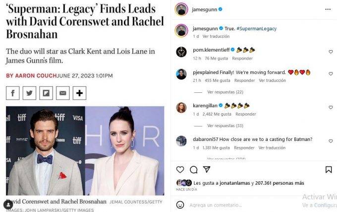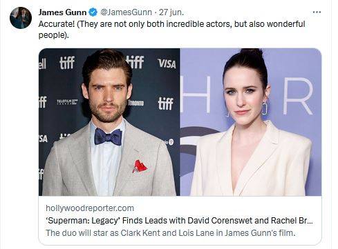 A través de sus perfiles de Twitter e Instagram, Gunn confirmó la información que brindó el portal Variety, que señalaba a David Corenswet y Rachel Brosnahan como Clark Kent y Lois Lane, aunque al cierre de esta nota también sonaba fuere el nombre de Brendan Fraser como Jonathan Kent.