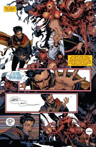 Dicho esto, entiendo perfectamente cuales son las críticas negativas que los detractores del pelado oriundo de Alabama elevarán cuando se refieran a esta serie: Aaron hace un uso excesivo del humor en los diálogos, y no conforme con eso hay infinidad de gags visuales esparcidos a lo largo de esta aventura. Esta nueva entrega de Doctor Strange (que comenzó su andadura en Octubre del año pasado) se aleja bastante de la solemnidad que suele rodear a este personaje, máxime teniendo en cuenta que la existencia del mismo es un drama en constante evolución, y suele haber poco espacio para maniobrar y dar paso al sarcasmo, al romance e inclusive al relajo. Con esto no quiero decir que nuestro amigo Stephen sea un ortiva amargo que te cae al clímax de la fiesta clandestina con la jueza y la federal para clausurarte la misma, pero entiendo que es poco común verlo combatir amenazas interdimensionales mientras larga chistes cual Spidey o ironiza sobre el estado de sus poderes. Sin embargo, el estigma y la impronta del personaje jamás se ven afectados por estos factores, y los elementos característicos del complejo universo que lo rodea están presentes en cada uno de los números de esta colección. Y a medida que la serie avanza el humor disminuye, y la tensión aumenta, de la mano de la desesperación que trae consigo el vaticinio del advenimiento de días oscuros y jodidos, no sólo para nuestro querido Doctor y sus aliados, si no para toda la existencia.